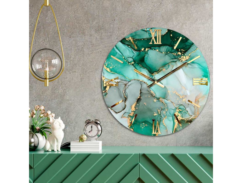 This handcrafted wall clock stands out for its distinctive style and strong decorative presence. Expertly crafted in Italy, it combines a wooden base with a deep, refined petrol green marble-effect epoxy resin casting. The surface is embellished with gold leaf appliqués, adding brightness and elegant textural contrasts. The gold-mirrored plexiglass Roman numerals and gold-plated metal hands complete a modern and sophisticated aesthetic. This modern wall clock with metallic elements is ideal for spacious spaces requiring a dramatic accent.