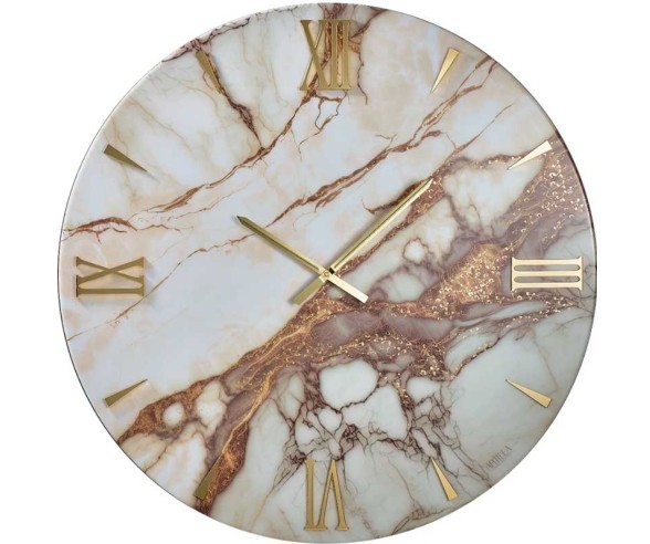Designed for spaces that want to stand out with elegance and brightness, this clock becomes the centerpiece of any wall. The beige marble-effect resin dial is traversed by rich, warm veining embellished with gold leaf, which reflects the light with refinement and creates a fascinating interplay of textures. The gold-mirrored plexiglass Roman numerals and gold-plated metal hands complete the aesthetic with a precious and contemporary touch. Ideal as a large wall clock for living rooms, dramatic entryways, or modern reception areas. Made in Italy.