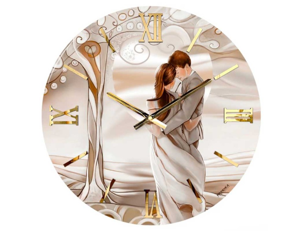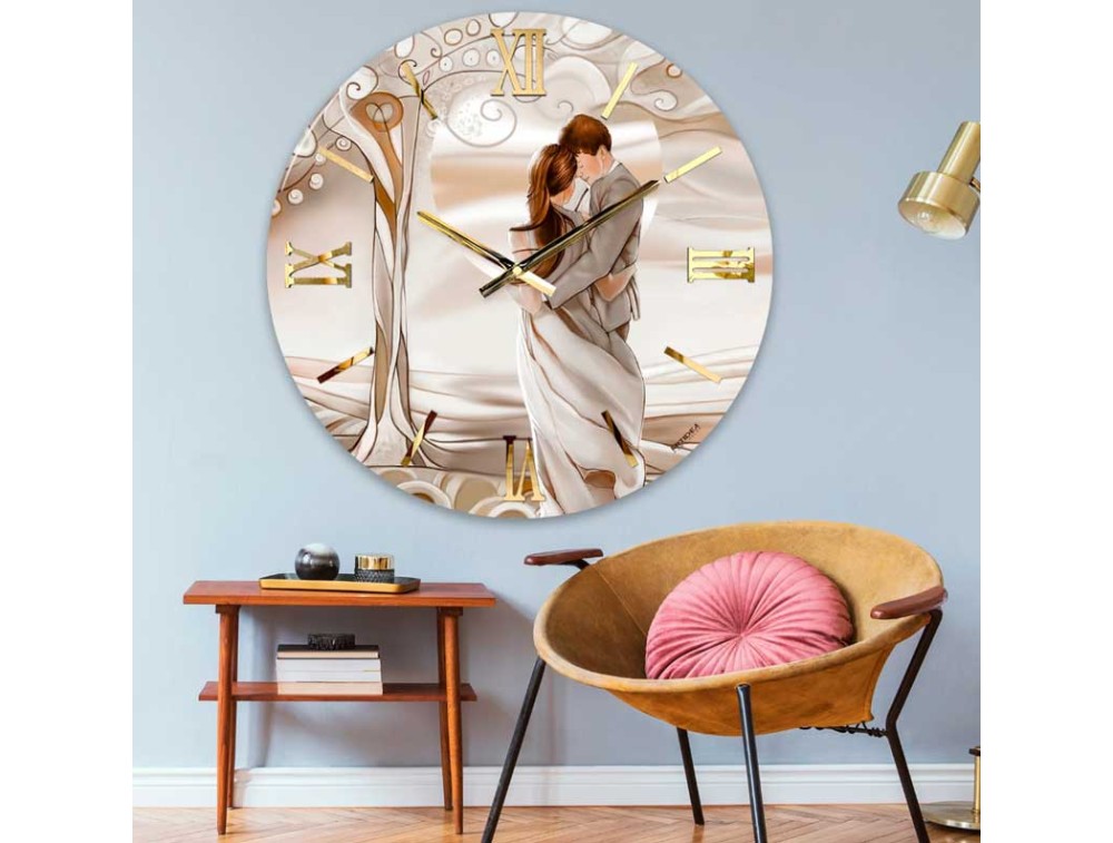 Circular clock with a polished dial, hand-decorated with gold leaf and overlapping numbers in polished plexiglass with a mirrored effect. Polished metal hands. Wooden base with polished cast resin. The style is pictorial, with soft lines and a dreamy atmosphere.