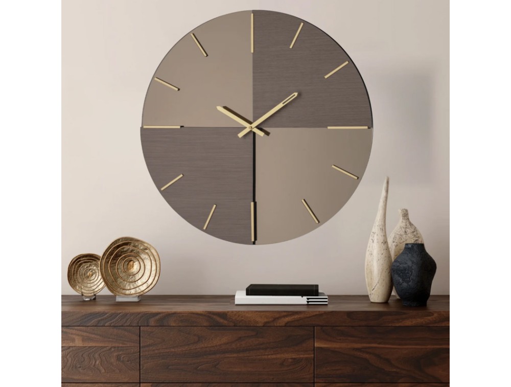 Stands out for its balance of reflective materials and matte finishes. The smoked or bronze mirrored glass base, divided into four sections with metallic cast appliqués, creates a captivating interplay of surfaces and depths. The linear plexiglass indexes blend harmoniously with the composition, while the polished metal hands add brilliance and precision. An elegant wall clock perfect for contemporary spaces with a minimalist feel. Shipping is free and the warranty is 2 years.