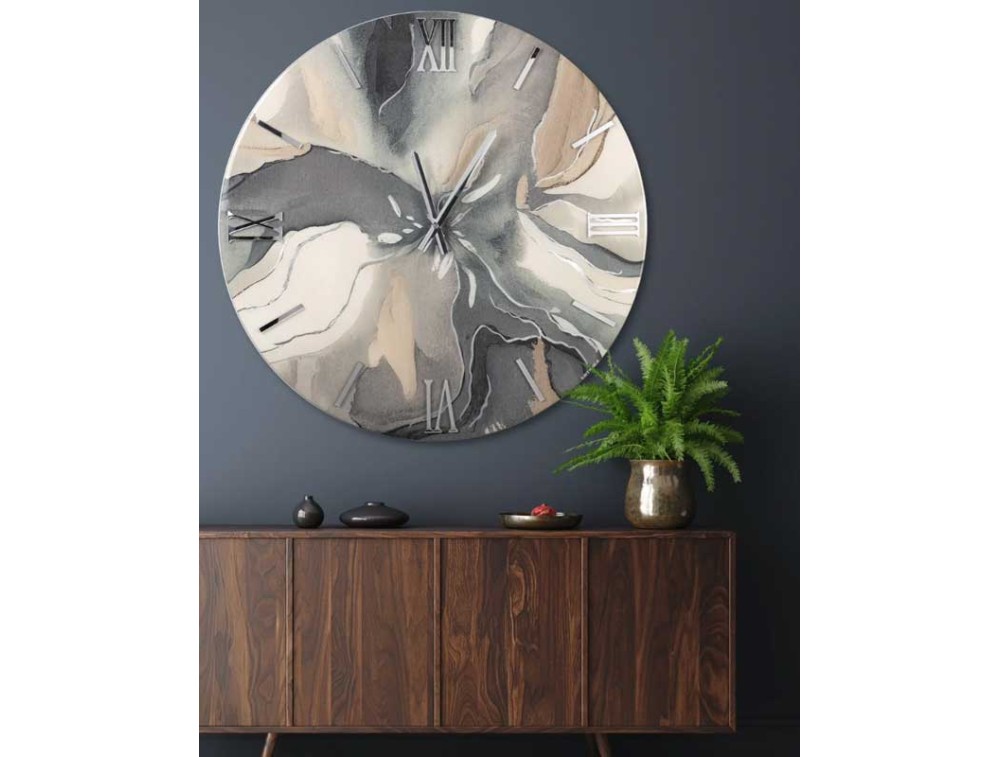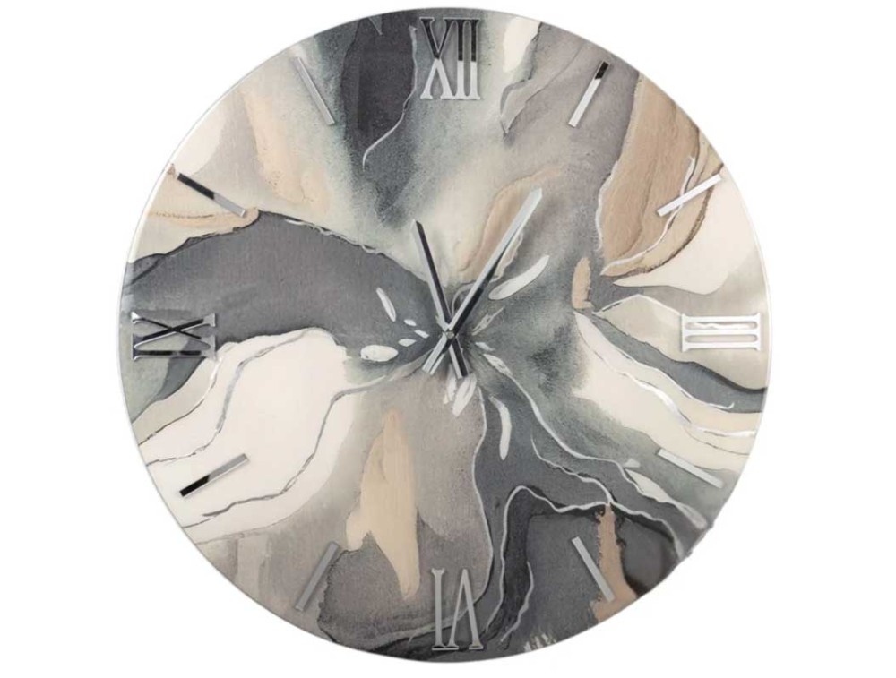 Designed for elegant and spacious spaces. Each piece is handcrafted and decorated in Italy, with a wooden base coated in UV-resistant epoxy resin to ensure stability and brilliance over time. The decoration features soft shades inspired by nature, enhanced by hand-applied silver leaf inserts to enhance the brightness and movement of the design. An elegant clock that complements its aesthetic with mirrored silver plexiglass numerals and silver-chromed metal hands.