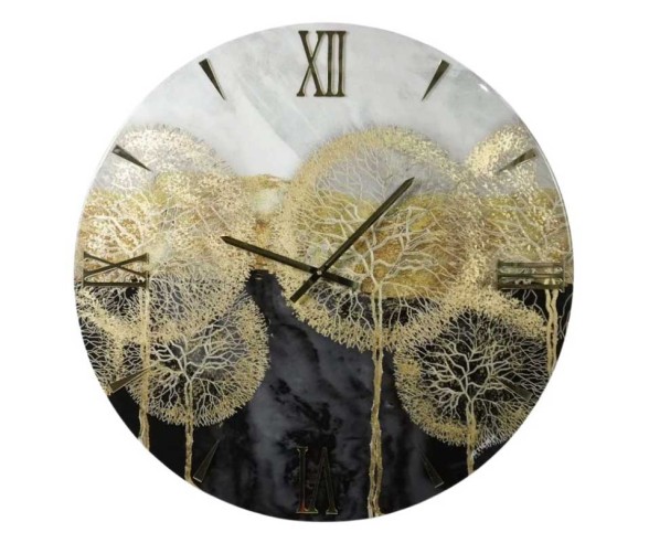 Circular clock with a polished dial, hand-decorated with gold leaf and overlapping numbers in polished plexiglass with a mirrored effect. Polished metal hands.