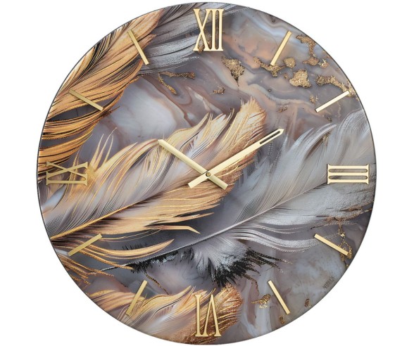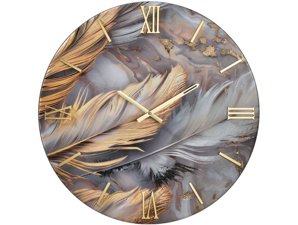 Circular resin-cast wooden clock with a glossy dial, hand-decorated with gold leaf and overlapping numbers in polished mirror-effect Plexiglass. Polished metal hands.