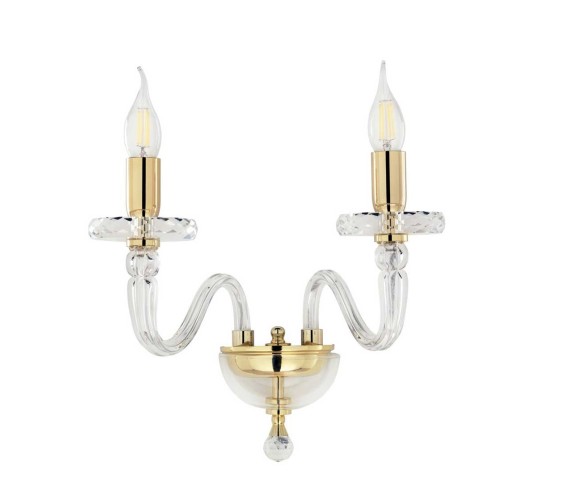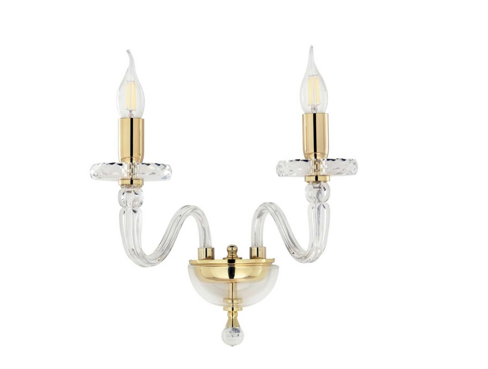 Ciciriello, wall lamp made of transparent glass worked by hand. Metal details, available in two finishes and two sizes.