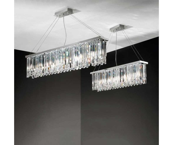 Polished chromed metal structure studded with excellent quality leaded transparent faceted lozenge-shaped crystals, perfect for installing above a dining table in a living room or lounge
