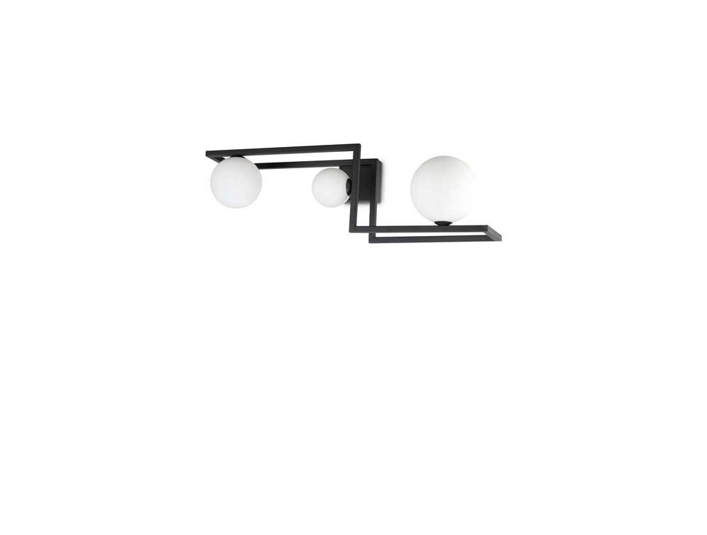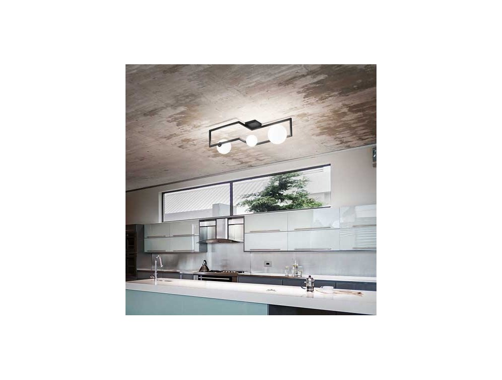 Corner ceiling light, a masterpiece with a minimalist and square design that is an ideal option for lighting residential environments, restaurants and bars with style. Its angular metal structure offers a contemporary touch, while the spherical white glass diffusers distribute the light evenly over 360 degrees