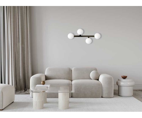 The Fuji series is characterized by its entirely dove gray metal structure and milky white glass spheres. This ceiling lamp which can also be installed on the wall is particularly bright, inside the 4 glass spheres you can insert light bulbs with GX53 socket.