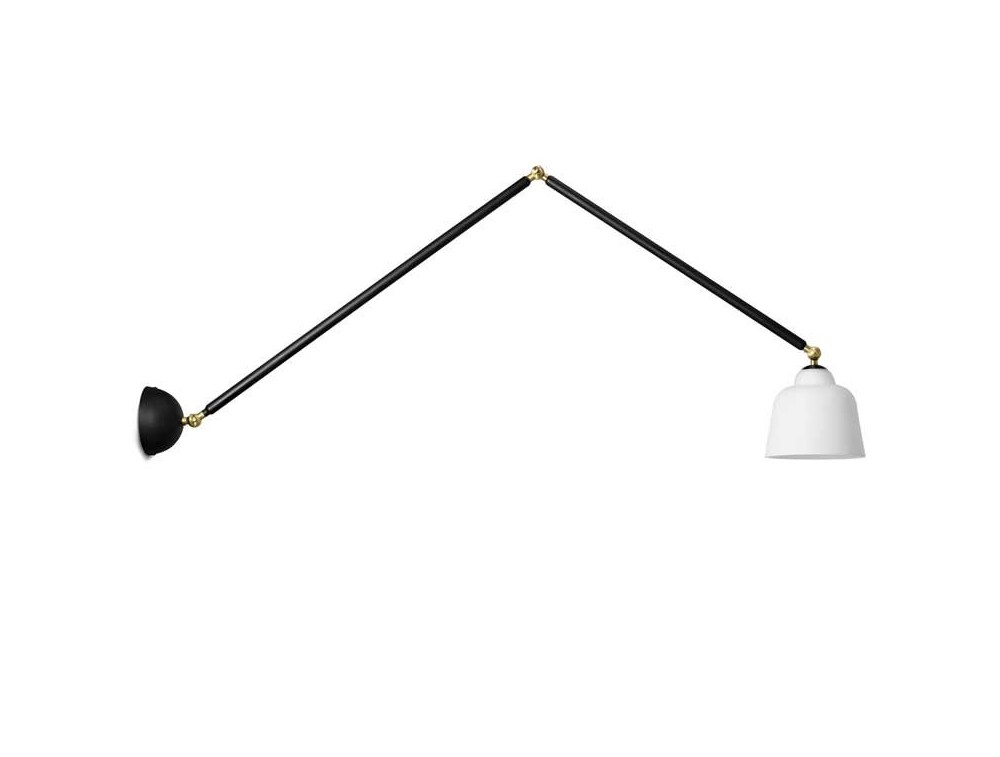It is a lamp characterized by a 124 cm long articulated frame in black metal, which makes it truly unique, while the diffuser, always adjustable, is a round shape and is made of white glass with a diameter of 17.5 cm while the joints are brass.