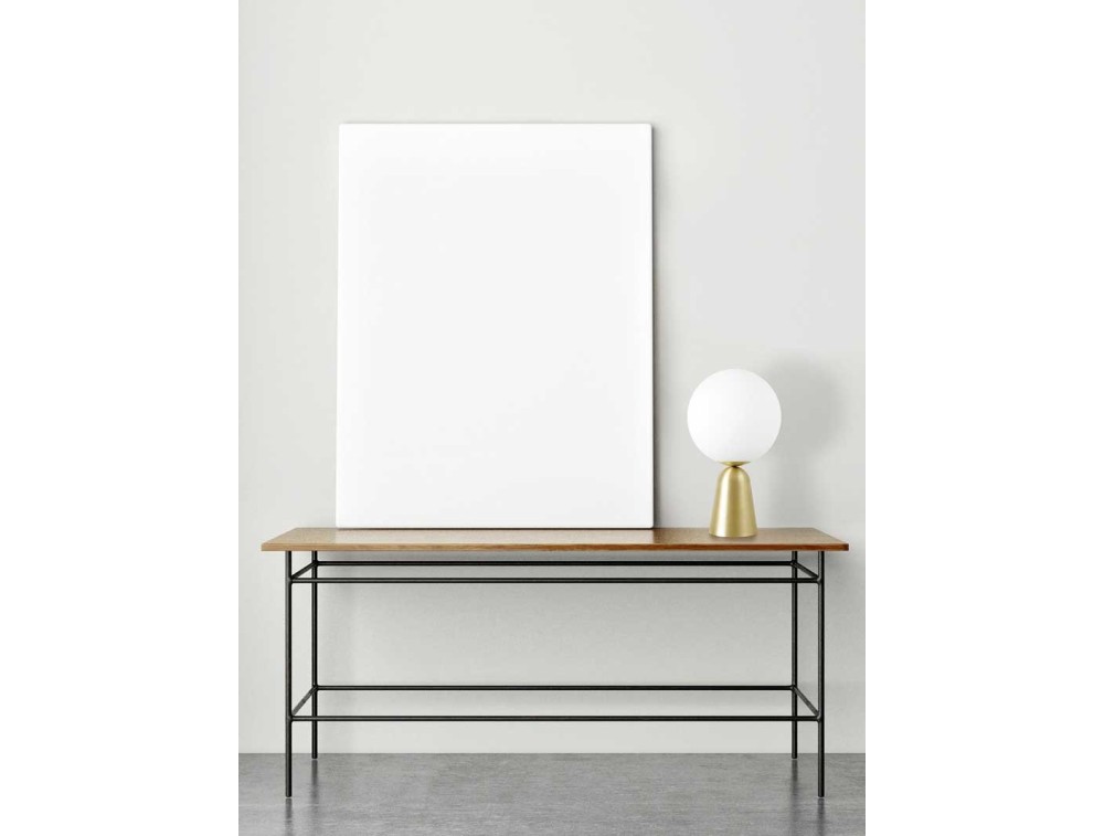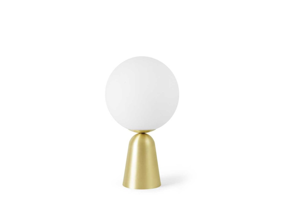 It is a table lamp, with a brass-coloured metal base in the shape of an inverted cone on which we find the spherical diffuser in opaque white glass.