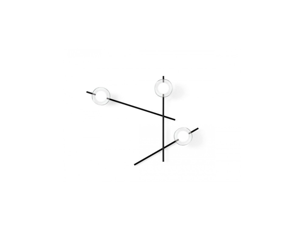A customizable wall light, as the structure is made up of three arms, of which two, the secondary ones can be rotated by choosing between 2 configurations. The structure is in black painted metal, while the three diffusers are spherical in shape and entirely made of transparent glass.