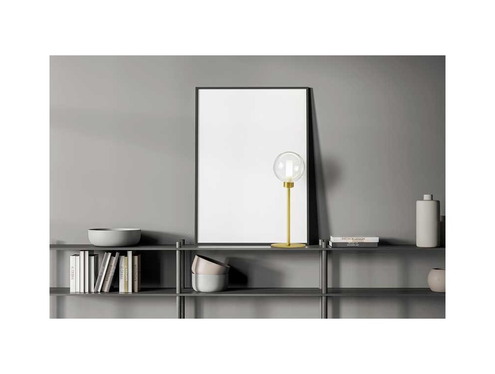 Bedside lamp for the Dom collection by Miloox, with a minimal design perfect for illuminating and furnishing the bedside tables of a bedroom in a modern or contemporary style. Made of brushed gold brass metal where a transparent borosilicate glass sphere is placed with an internal cylinder shielding the satin glass bulb.