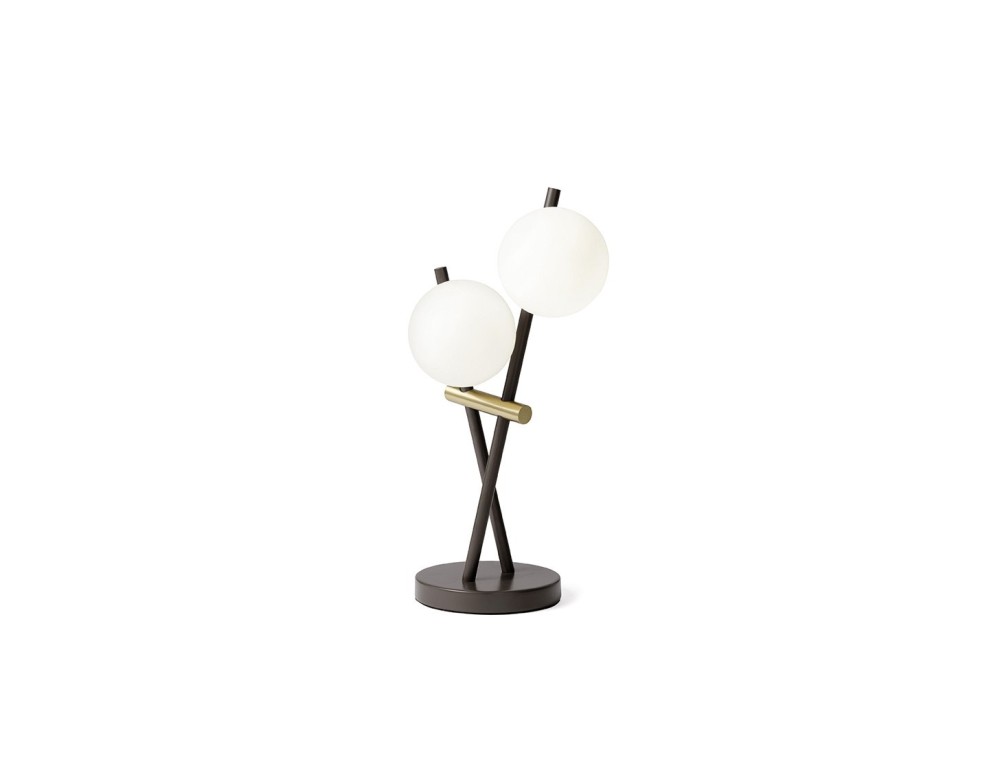 The Black Licorice colored metal base, accented by brushed gold details, blends with the milky white blown opaline glass spheres to create a luminous art object that attracts the eye and enriches any environment.