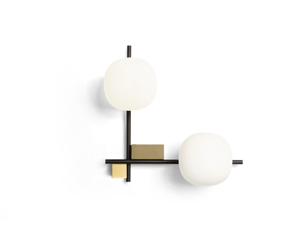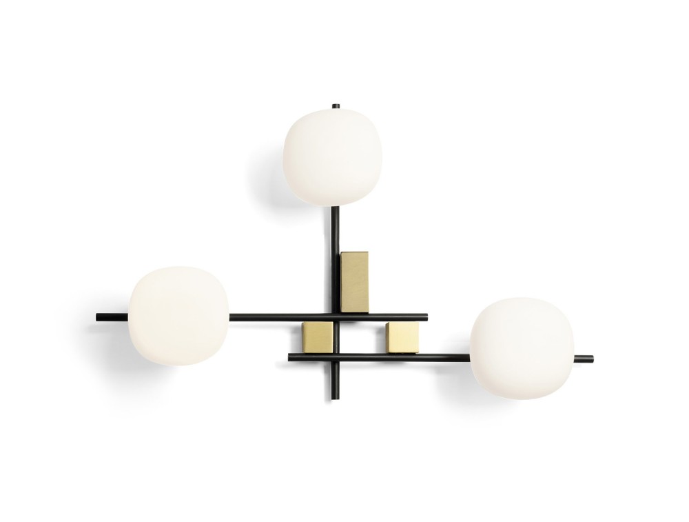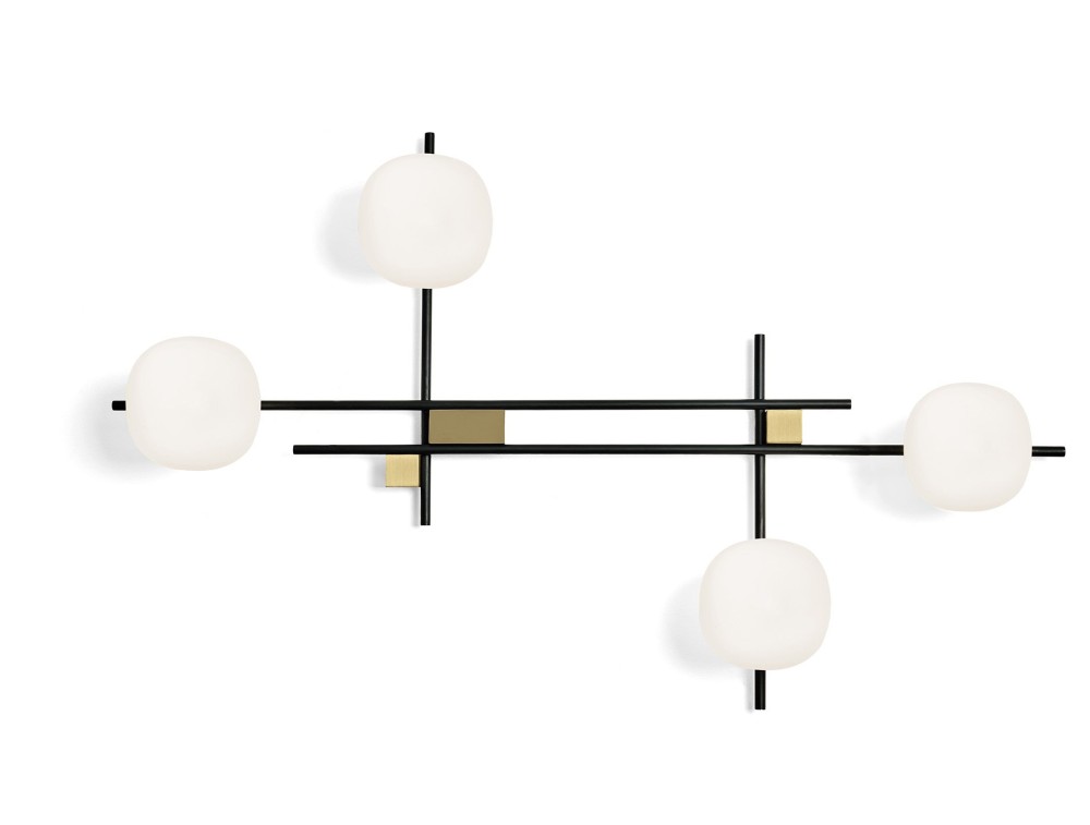 The particular shape and three-dimensional details in golden metal give a modern and sophisticated look, while the rounded opaline glass amplifies the linearity of the design.