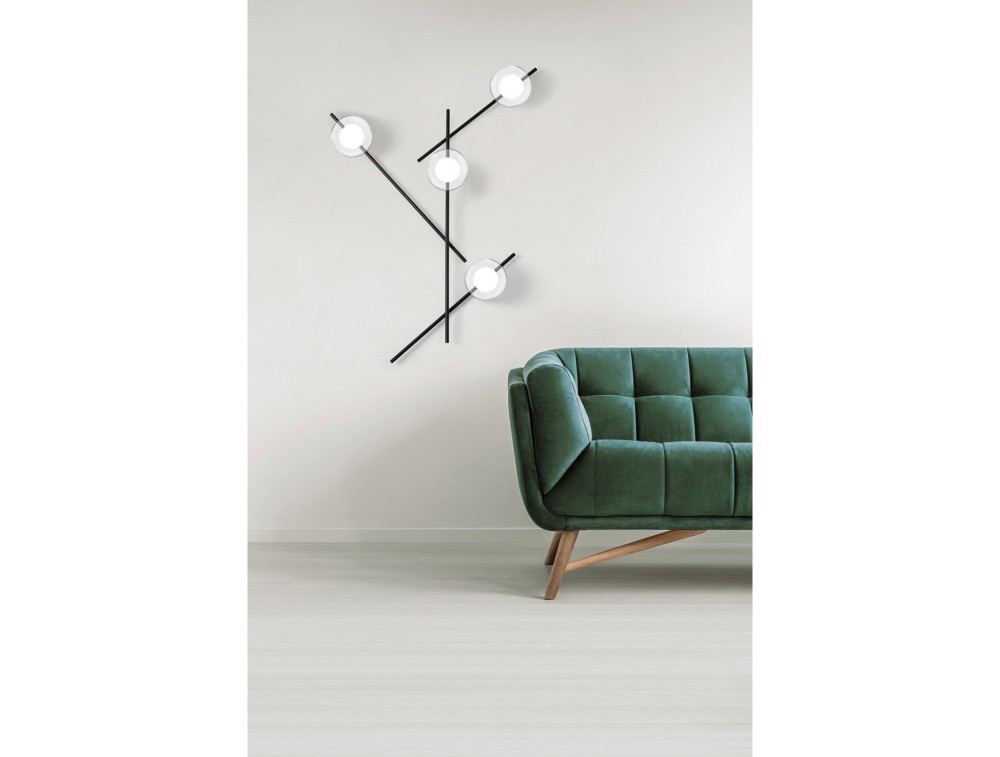 A customizable wall light, as the structure is made up of 4 arms, of which two, the secondary ones can be rotated by choosing between 2 configurations. The structure is in black painted metal, while the diffusers are spherical in shape and entirely made of transparent glass. The bowl shape of the 4 diffusers, with a diameter of 12 cm, spread the light throughout the surrounding environment and on the wall, also available in the variant with transparent spheres. A perfect wall lamp for lighting both residential and commercial environments, you can create personalized atmospheres by combining other products from the same series.