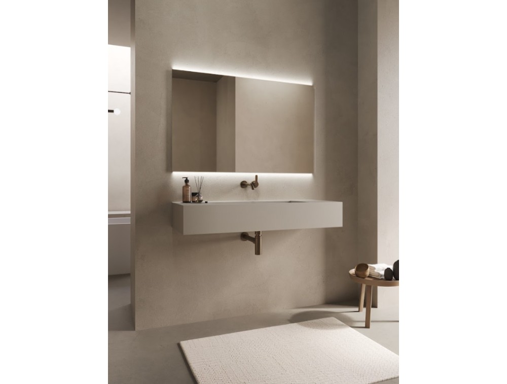 Polished-edge mirror with top and bottom LED backlighting. 4mm thick. Custom sizes are available upon request. IP44 protection. Reversible.