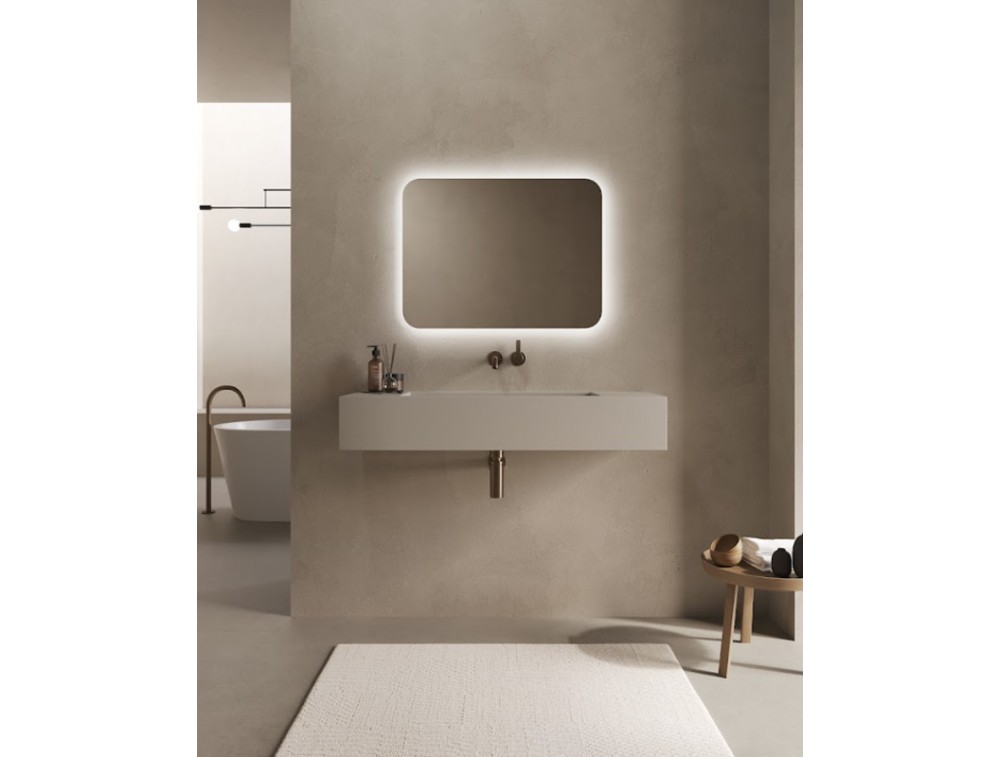 Polished-edge mirror with rounded corners and perimeter LED backlighting. 4mm thick. IP44 protection. Reversible. Custom sizes are available upon request.