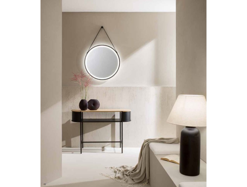 A model with a strong personality, featuring a satin-finish circular LED, a metal frame, and a black leather band with an anchoring nail. Direct and indirect light, adjustable to 3 color intensities via touch control. Explosion-proof PVC film construction. Light source lifespan 30,000 hours. Clean lines and modern design blend together in this round wall mirror, perfect for bathrooms or contemporary makeup areas. The backlit effect not only enhances the space but also ensures precise and functional lighting.