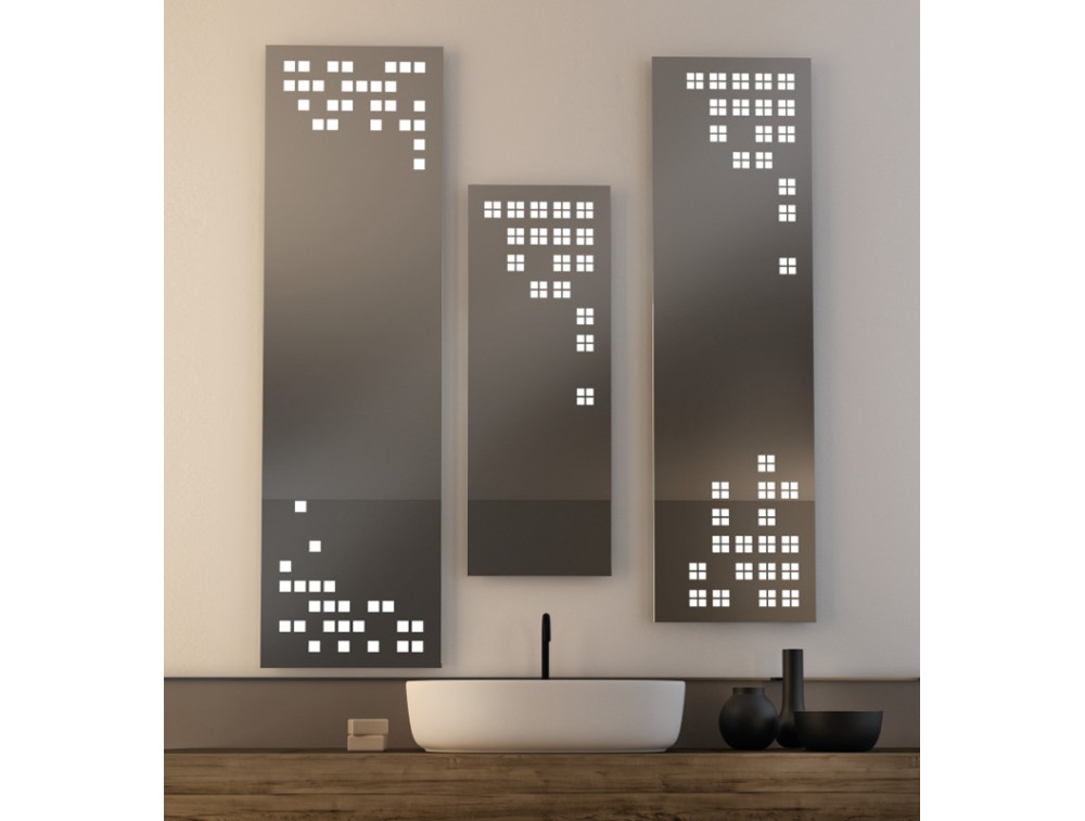 Satin stainless steel frame. IP44 protection. 5-year LED warranty. 4mm mirror thickness. They evoke the image of a modern skyscraper. Equipped with an innovative LED lighting system, these mirrors allow you to adjust the light intensity through practical controls integrated directly into the reflective surface.