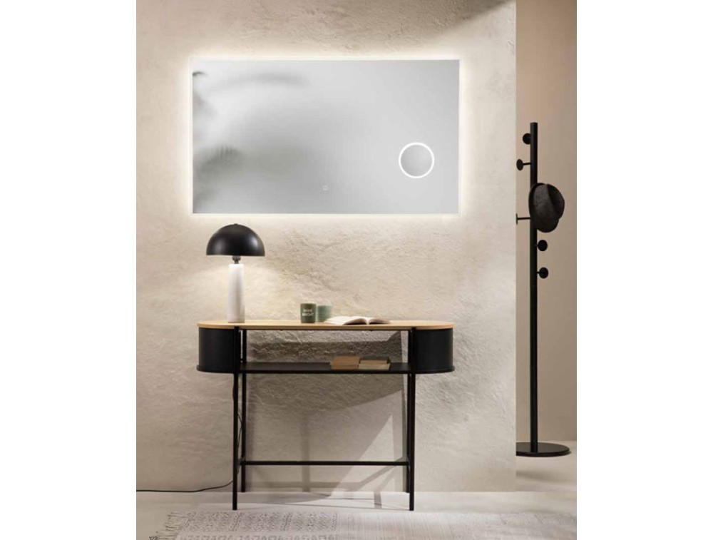 The image shows how the mirror pairs beautifully with natural materials and matte finishes. The contrast between the cool, neutral LED light and the warm texture of the sand-colored wall creates a relaxing and luxurious atmosphere. Shipping is free and the warranty is 2 years.