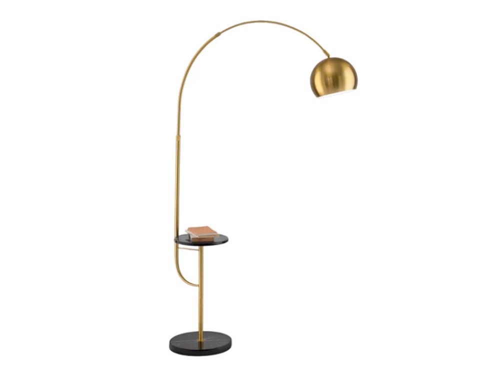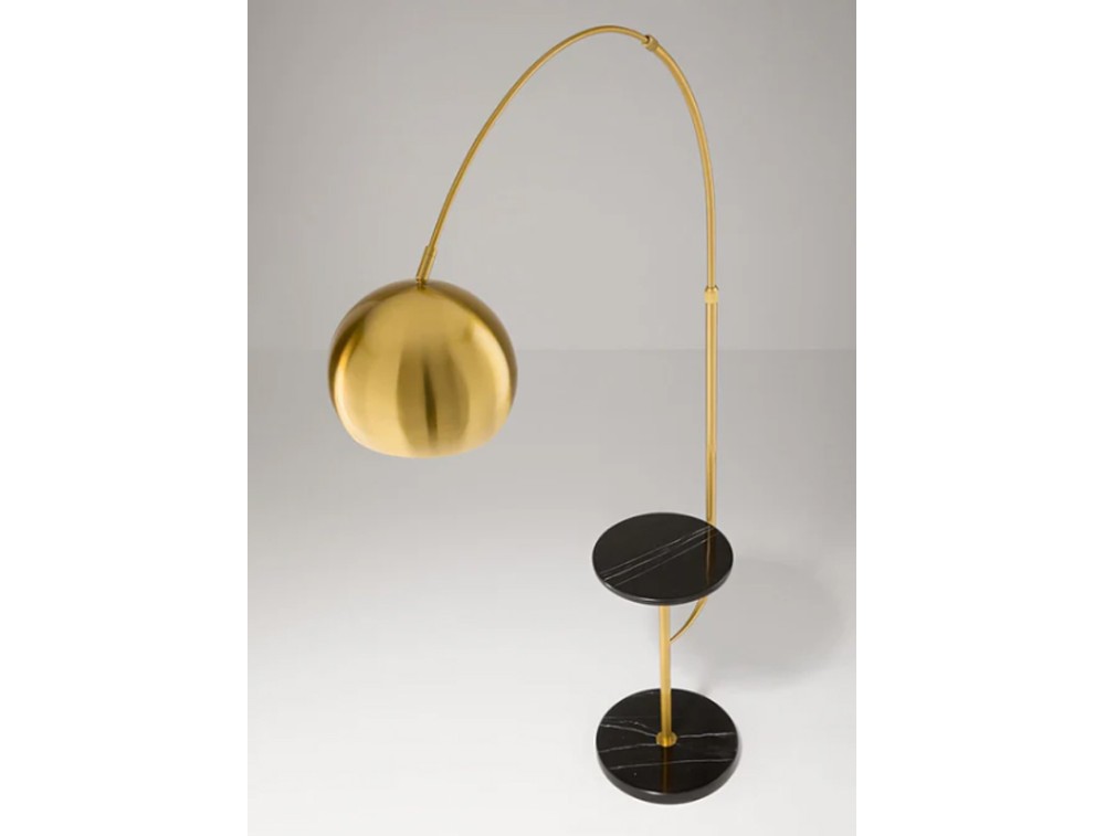 This floor lamp combines functionality and refined design, featuring a metal and aluminum frame with a burnished brass finish and a practical black marble tabletop, perfect for placing books, objects, or drinks. The lampshade is adjustable up to 180°, allowing you to precisely direct the light as needed. It can be turned on and off via a foot switch, ensuring convenience and practicality for everyday use.