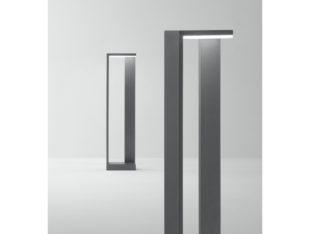 Outdoor bollard lamp with a satin acrylic diffuser and a graphite powder-coated metal and aluminum frame. Ideal for driveways, gardens, walkways, and any outdoor area. Integrated LED light.