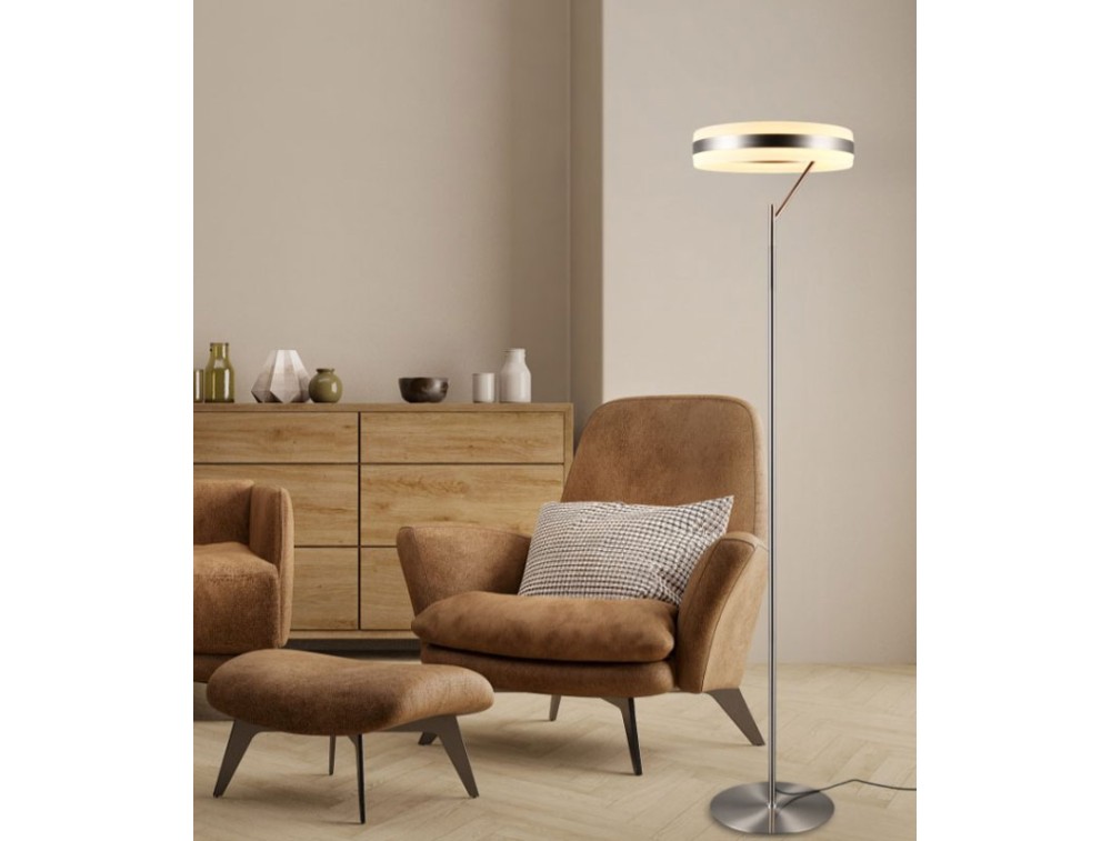 Nickel or black metal floor lamp with LEDs and dimmable function. Perfect for the kitchen, living room, and bedroom. Equipped with a switch and touch sensor dimmer. 5-year LED warranty.
