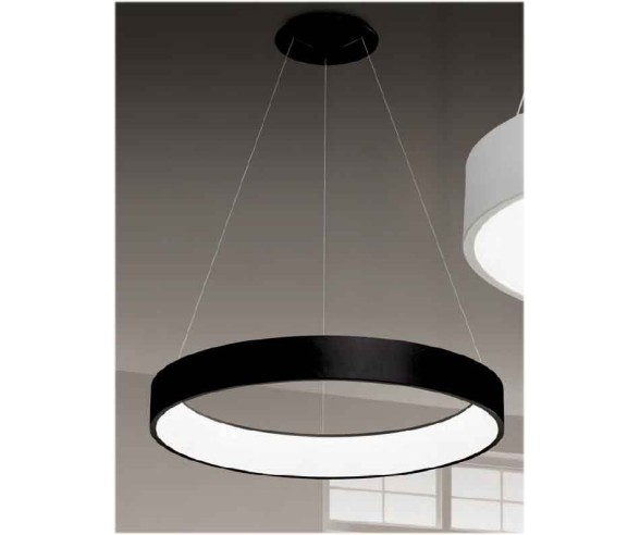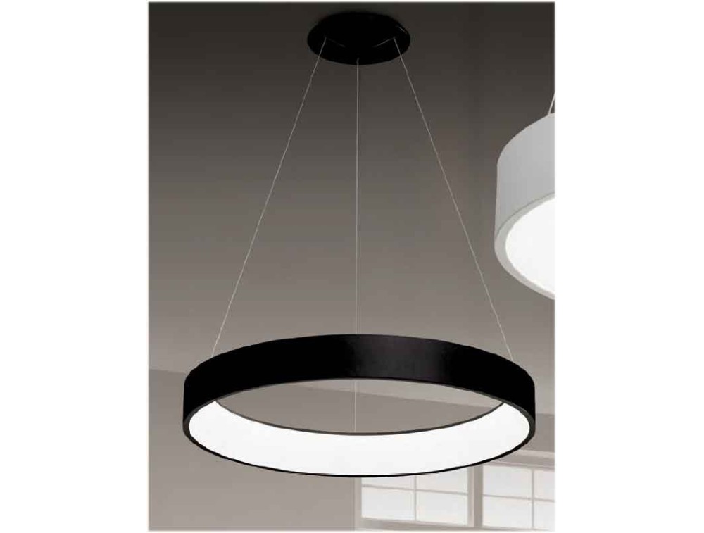 Suspension lamp made with black varnished metal structure and acrylic diffuser. The led light spread its brightness through the circular shape acrylic diffuser taht lights all the environment in which is placed. This suspension is extremely versatile and bright thanks to its light colour finish ideal in modern design environments such as dining room, living rooms, kitchens and bedrooms.