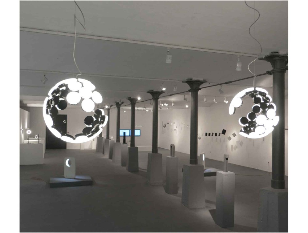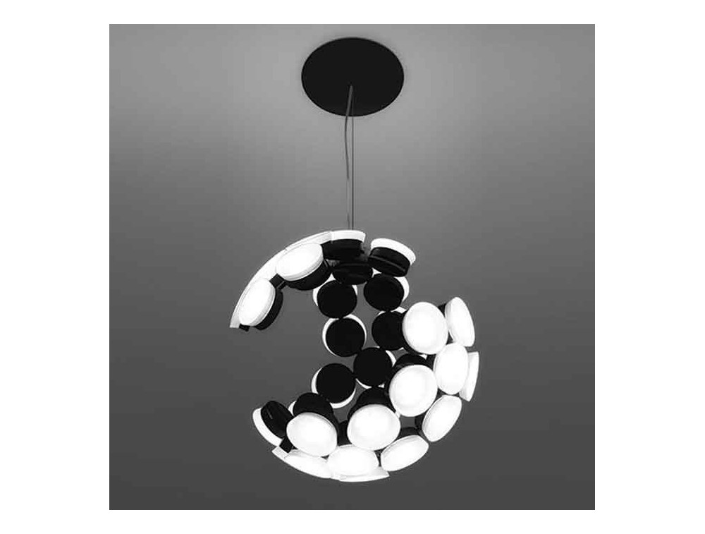 Suspension lamp made with aluminum structure internally painted in black, and white thermoplastic diffuser. Generated by the repetition of a circular form, Scopas materializes an incomplete, suspending sphere. From the ever-changing aspect depending on the point of view, it radically moves away from the register of pure and even monotone forms usually associated with this type of lamp. Ideal in design rooms.