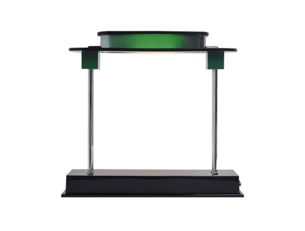 Design table lamp made of brass structure and methacrylate diffuser, lamp with double green and aluminum finish with black base. Lamp with LED source that recalls a newer ministerial lamp, with a modern and revisited line that guarantees functional lighting, perfect for desks, offices and bedside tables where functional light is required.