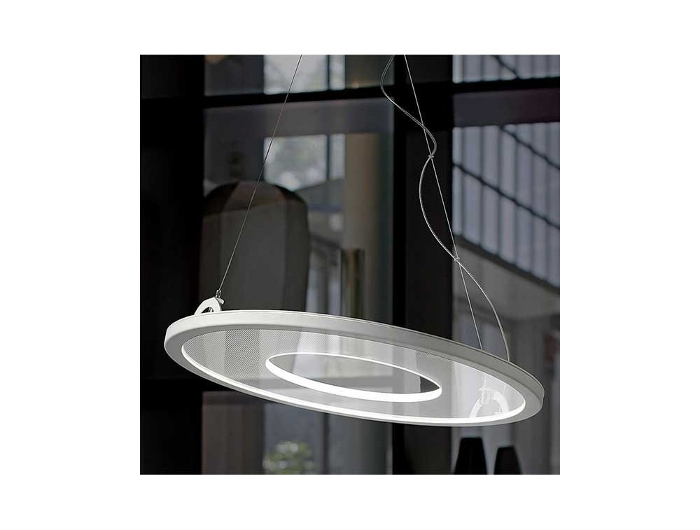 Suspension of a discounted shape but of great effect, thanks to the transparent dotted material that composes it. A suspension that in its simplicity furnishes offices, desks, dining tables or can simply be mounted in the center of a room. A simplicity that does not weigh down the furniture and that bears the signature of Made in Italy.