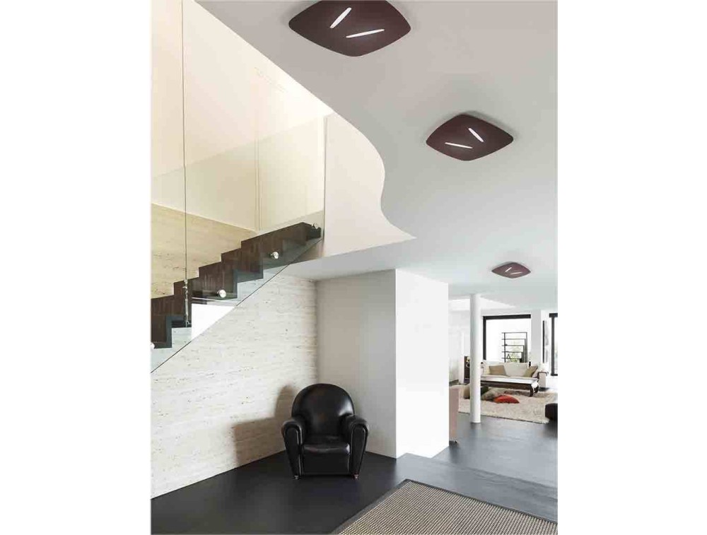 Ceiling lamp made with varnished metal structure available in corten , sand, gray or white finish. Innovative design lamp , versatile thanks to its squared diffuser line with soft edges. Its diffuser emits the light beam throught the stick opening on the surface. Ideal lamp in modern and linear design environments.