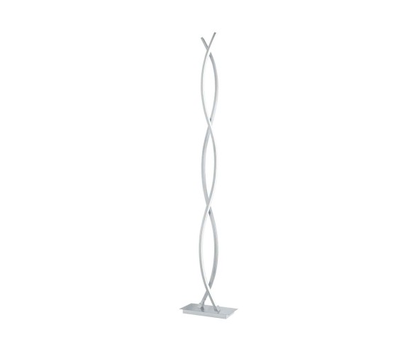 Modern design led floor lamp made with steel and aluminum structure in chrome finish and white plastic diffuser. Lamp composed by the diffuser with two spirally interwoven rods, waves that contain in them the LED source, thin and functional this lamp is versatile and suitable in modern design environments of all sizes.