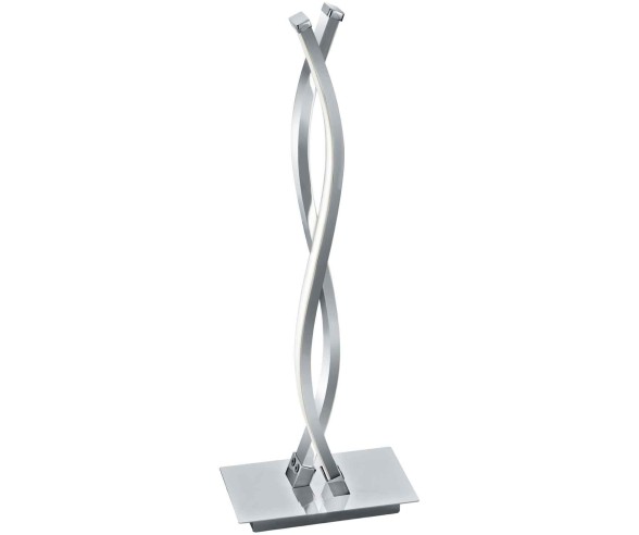 LED table lamp of modern design made with steel and aluminum structure in chrome finish and white plastic diffuser. Lamp composed by the diffuser with spirally interwoven rods, the waves contain in them the LED source, thin and functional this lamp is versatile and suitable in modern design environments of all sizes.
