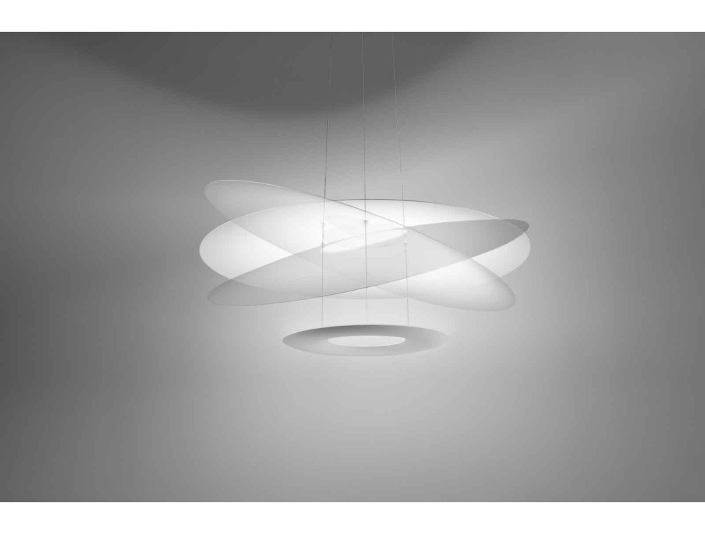 Suspension lamp made of aluminum and PMMA painted in white finish. Two rings of light fluctuate parallel, the lower ring turns the light beam towards the overlying aluminum diffuser, adjustable, by the enveloping concave shape, for an indirect and homogeneous interaction of light. A perfect suspension to illuminate classic or modern residential environments.