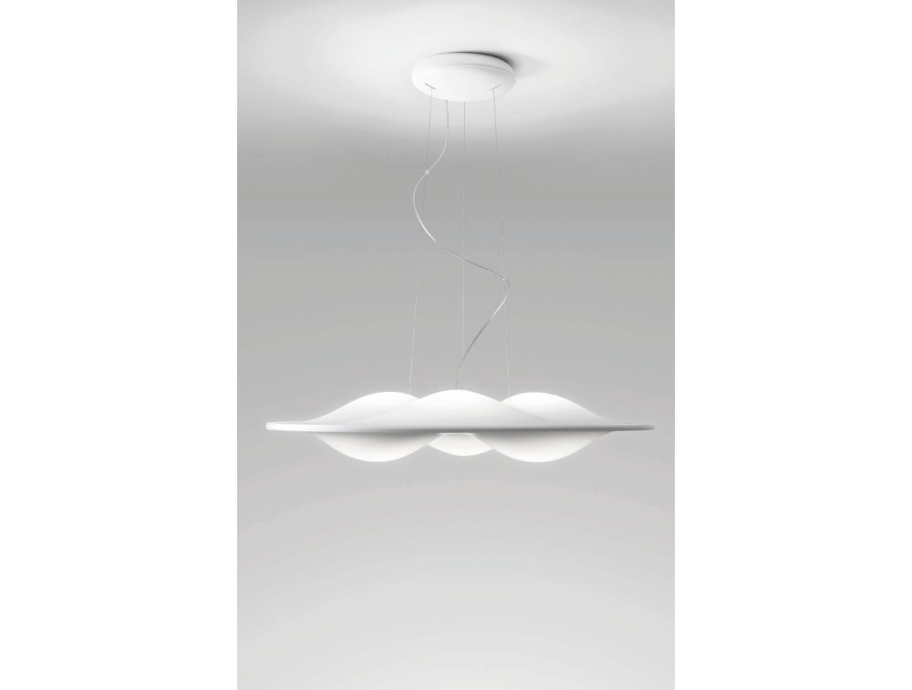 Suspension led lamp made by white alluminium frame and a thermoformed white satin PMMA double shell diffuser. Lamp characterized by a mix of clear shadows  that comes out of the warm led light . This lamp has a soft lighting, ideal for hotel open space and elagant private residence.