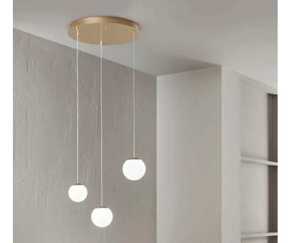 Santos pendant chandelier made with a gold painted metal structure where spheres of different sizes in satin white glass are placed.
