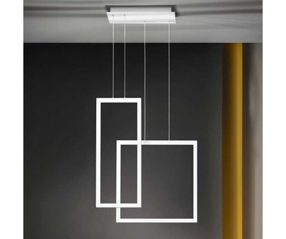Suspension lamp from the Cross collection of Perenz Lighting made with an opaque white painted aluminum structure and acrylic diffusers. Suspension of new design with geometric panels overlapped between them that indirectly illuminate the room and at the same time furnish it. The layout of the squares can be customized according to your tastes or needs. The integrated LED module allows you to achieve significant energy savings.