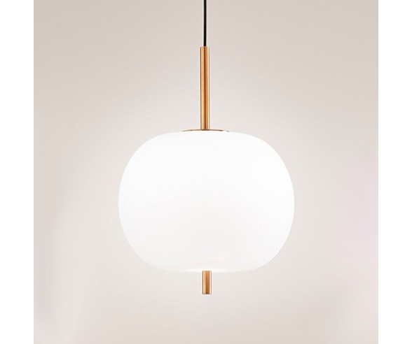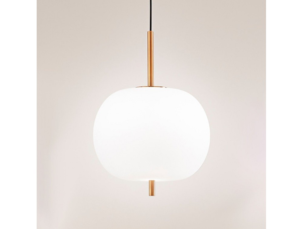 Perenz, suspension in brushed gold metal, satin white acid-etched blown glass diffuser. Integrated led included. Height adjustable. Hot light.