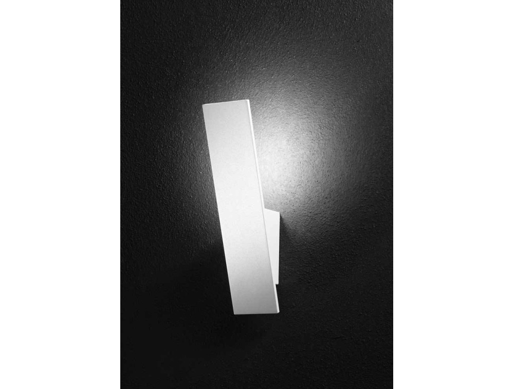LED wall lamp made of varnished metal, white color. Lamp with basic and bright design consisting of a rectangular structure vertically placed that contains the light source that gives direct and indirect lighting. Ideal for aisle and environments where light is required for a long amount of time, modern design.
