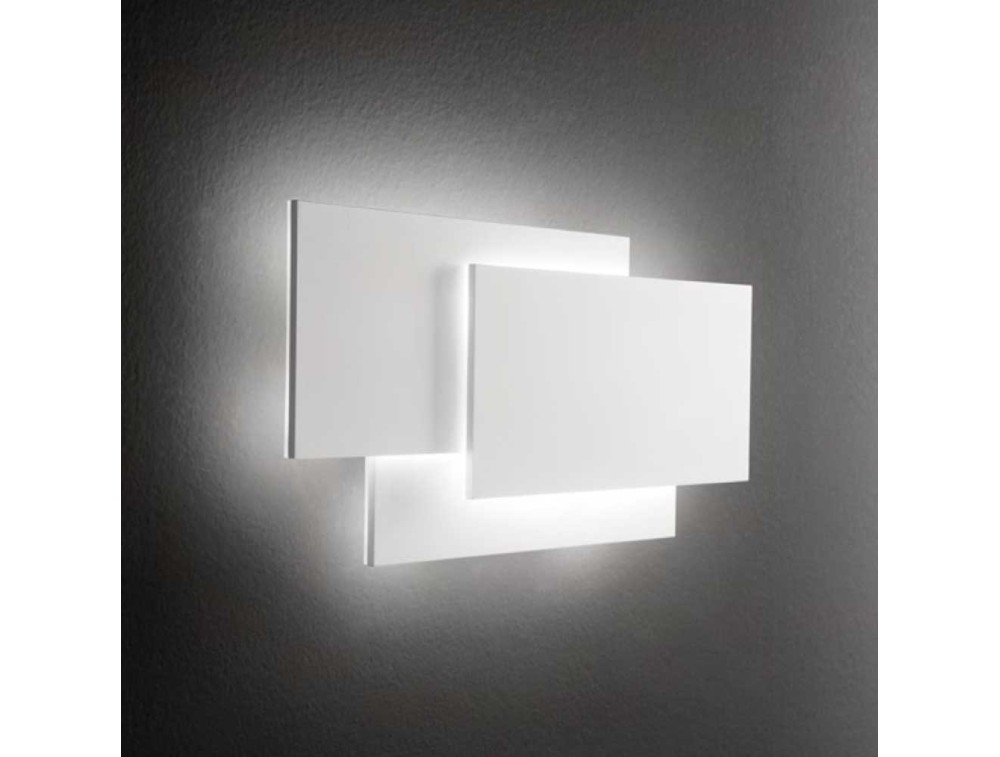 Wall lamp in matt white powder-coated aluminum, made up of three staggered overlapping rectangles. Lamp with a clean and linear design that illuminates the environment with its simplicity and transparency. Ideal for modern and linear medium-sized environments.