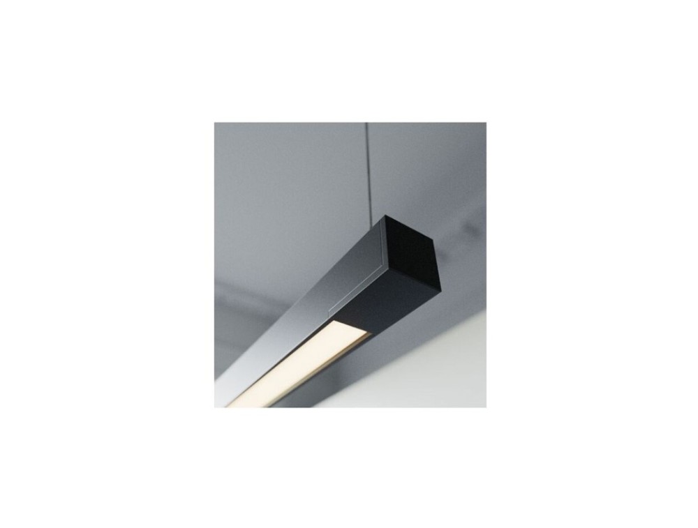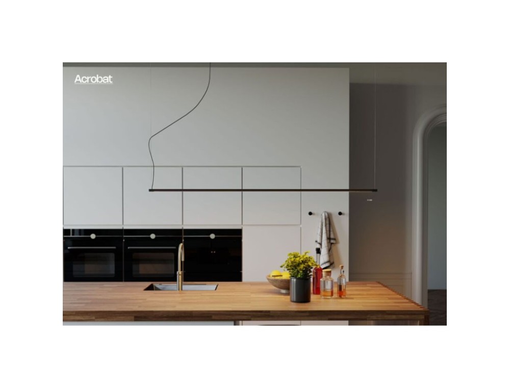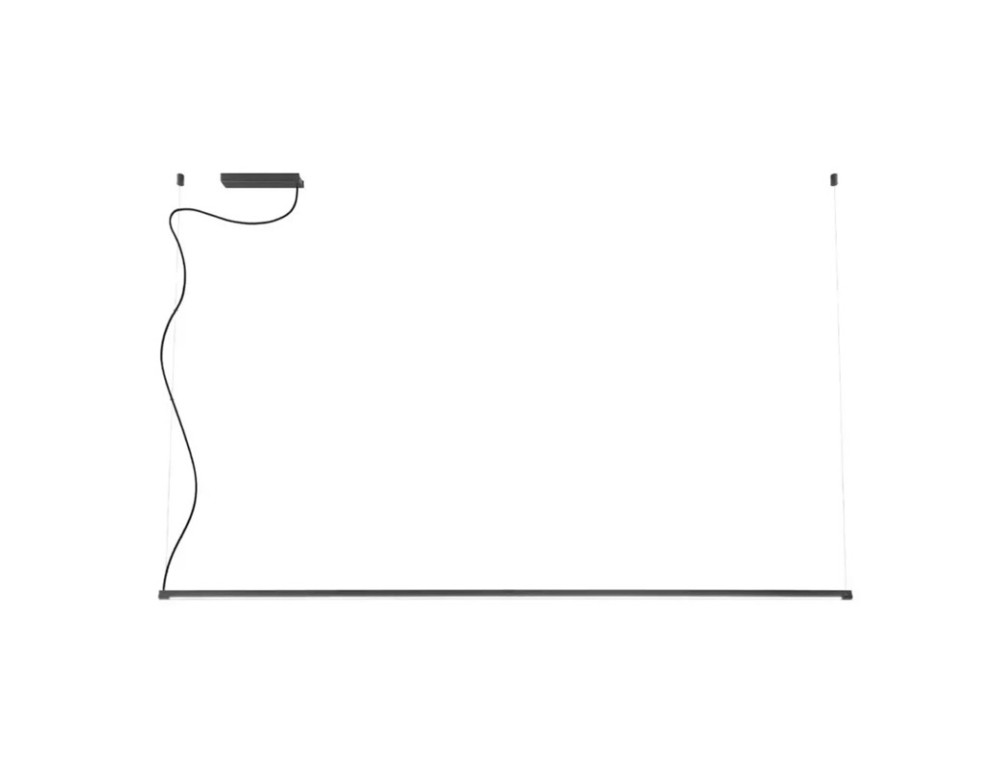 Structured aluminum and metal pendant with an opal acrylic diffuser, perfect for illuminating and decorating kitchens, living rooms, and bedrooms. Featuring an ultra-thin, elongated profile in an elegant matte black finish, it extends horizontally to provide efficient, even lighting, offering a minimalist and functional expression to your spaces, while still being eye-catching even when turned off.