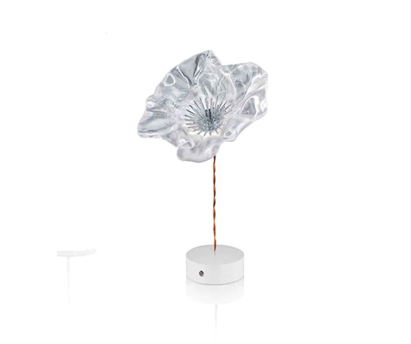 Going beyond the boundaries of the already seen and finding a new compositional language is what guided Marc Sadler's research process on Slamp's technopolymers. The result is Lafleur, the delicate and delicious table lamp with rechargeable battery that is born by heating the lentiflex at controlled temperature and literally modeling it by hand until it gives life to the corolla of a flower. The base is magnetic and a metal disc is also supplied in a combo which can be hidden under the tablecloth of a mise-en-place or screwed to the wall to quickly transform Lafleur into an applique.