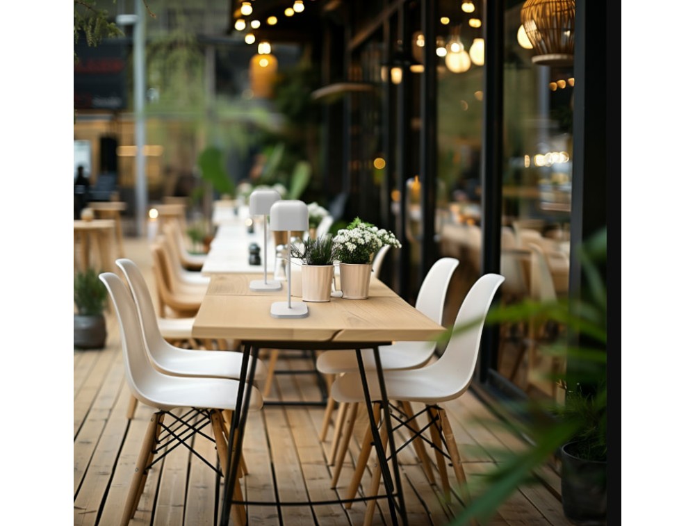 Although designed for outdoor use, its clean design also makes it suitable as an ambient light on a bookshelf or bedside table indoors. Thanks to the opaque shade, the light is projected primarily downward, illuminating the tabletop without dazzling diners. Shipping is free and the warranty is 2 years.