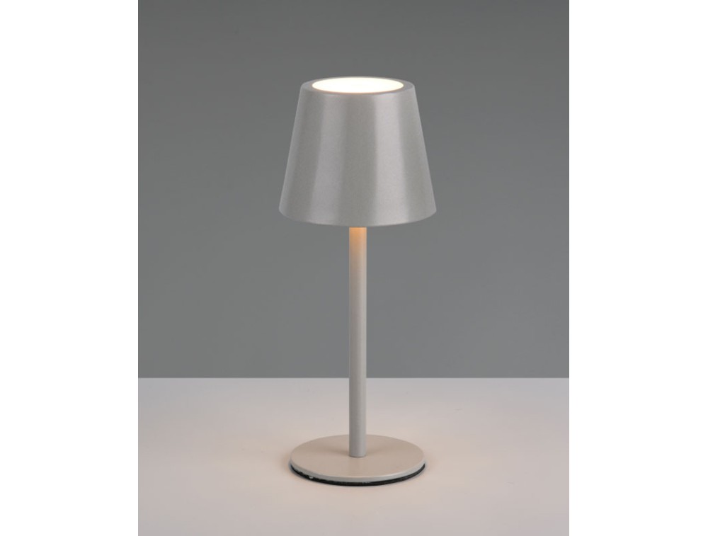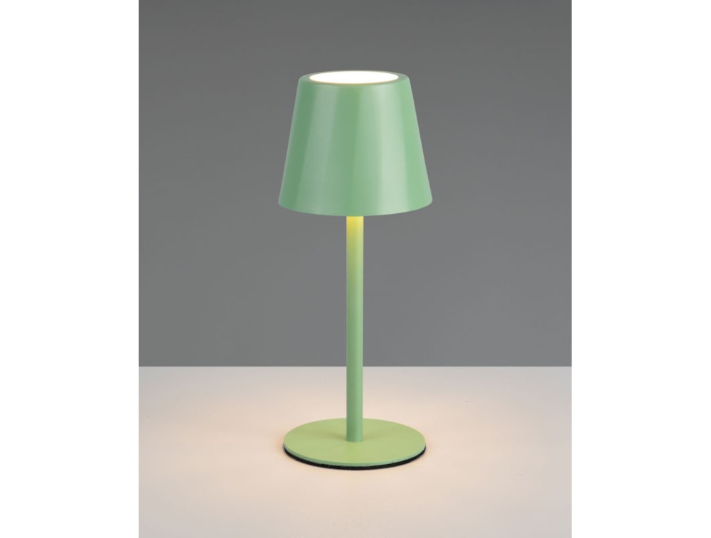 Portable LED lamp with dimmable function, made of sand, white, black, gray, and pistachio-colored metal. Three-level touch switch for brightness. IP44 protection.