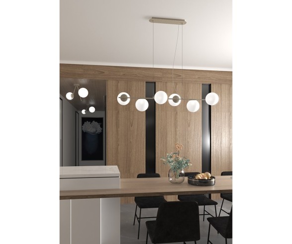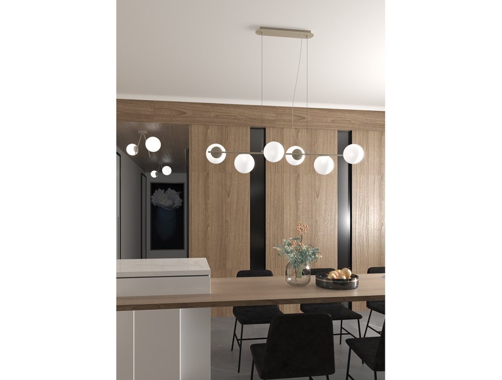 Every detail of this chandelier is designed to enhance functionality without neglecting aesthetics: the threaded glasses ensure simple and quick maintenance, ideal for those looking for practical but stylish solutions. Thanks to the adjustable cables, it is possible to adapt the height of the chandelier to different needs, making it perfect for elegantly illuminating both the dining area and a welcoming living room.