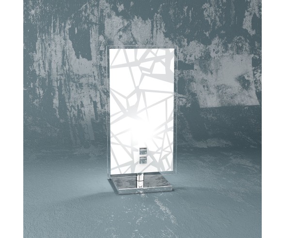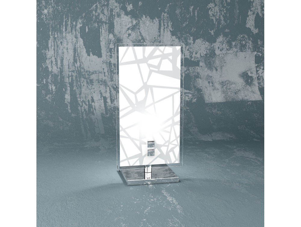 Top light table lamp made with white varnished metal structure and chrome details , diffuser with backround in white pirex glass and transparent finish edges.