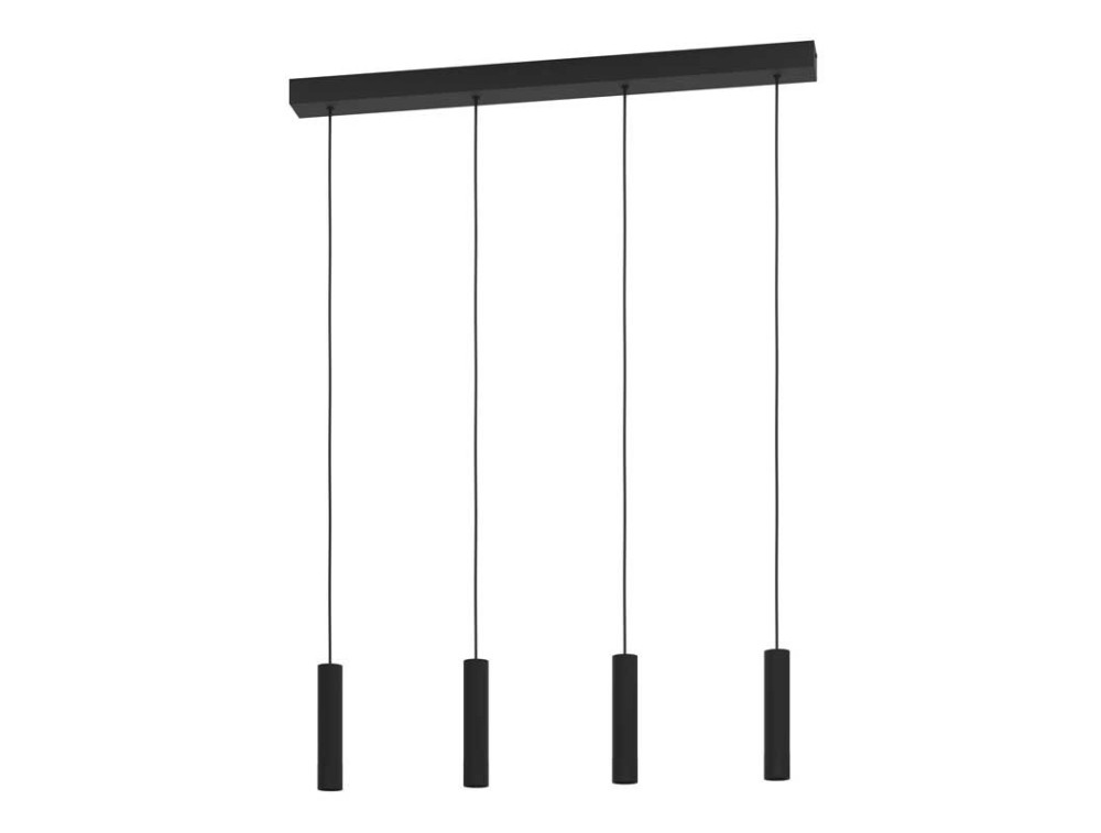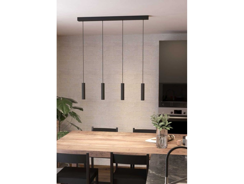 Ideal suspension for a kitchen table, a peninsula or a counter, with black steel structure and integrated LED.