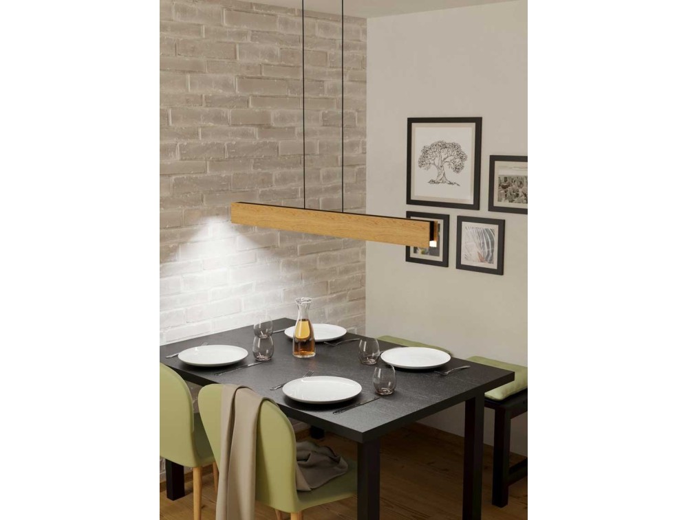 The ANCHORENA-Z LED pendant lamp from the connect.Z Smart Home range consists of an elongated suspended wooden body and an illuminated surface in matt white plastic and a black metal ceiling mount.