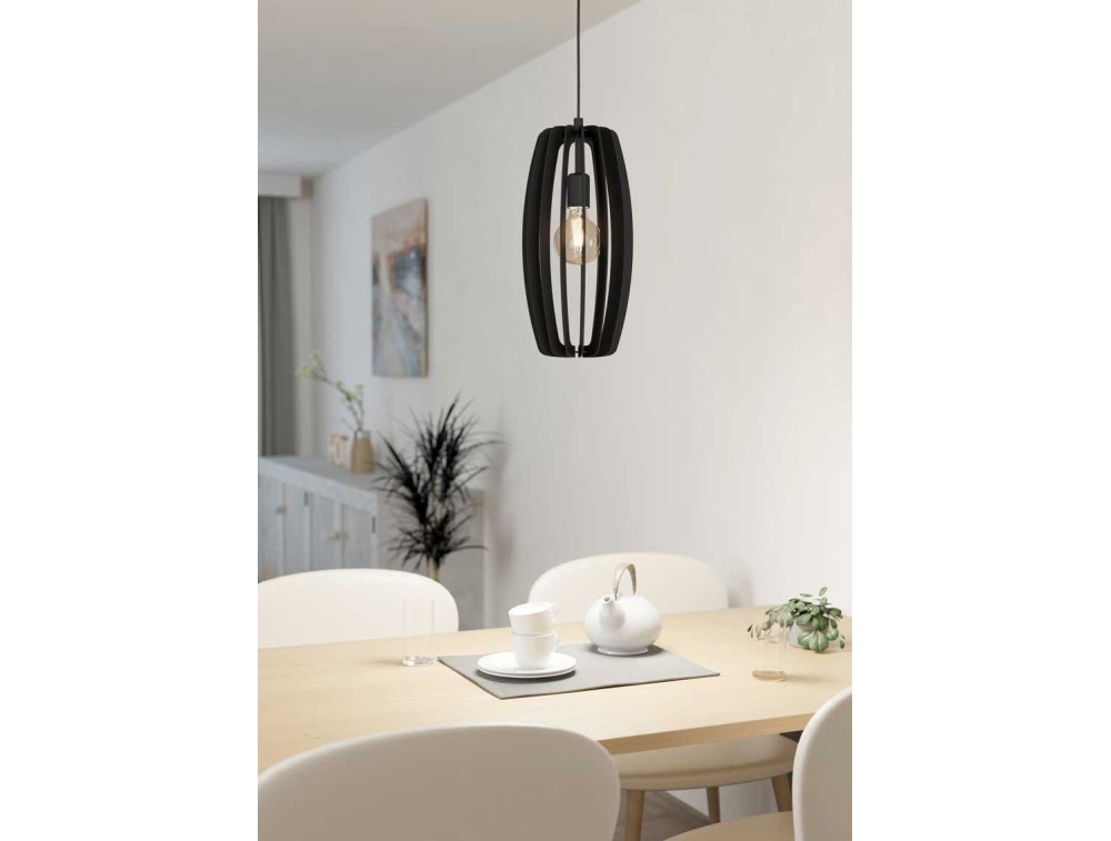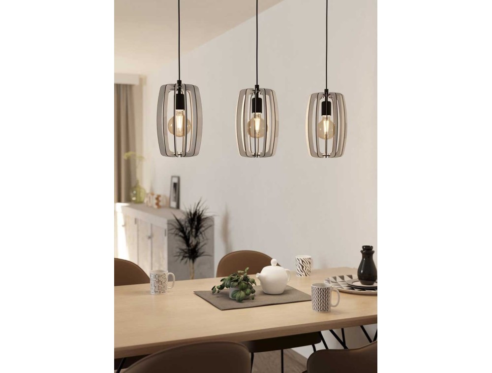 Chandelier made of black or gray wood, available with one light for small rooms or 3 lights for medium-sized kitchens or living rooms. Black steel ceiling structure.