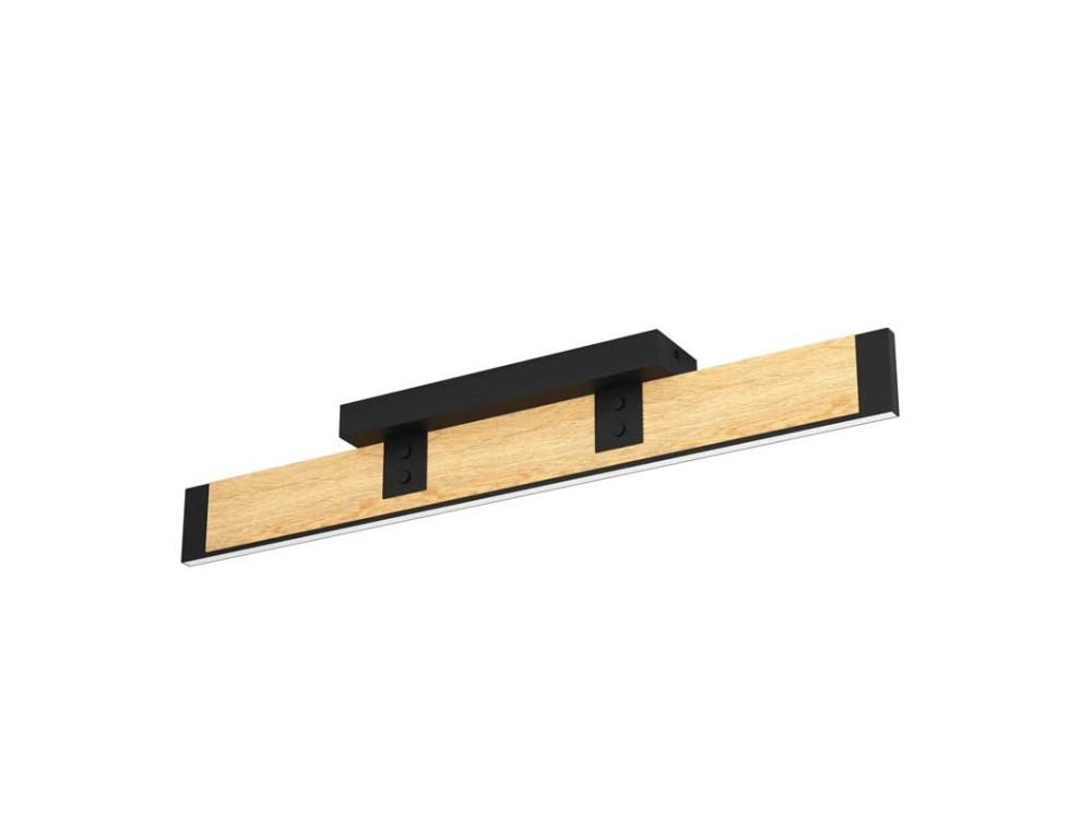 The CAMINARRO LED ceiling light consists of a rectangular black ceiling support, combined with a natural-colored wooden element with integrated LEDs.